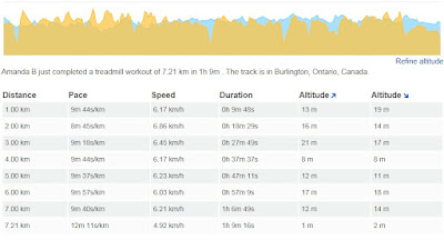 Thanks my DH influence we got home and got ready to go. Since it was sticky and hot out I dug out my lulu shorts instead of the usual crops I run in hoping it would help keep my temperature down a bit. This was a very bad idea after the first 10 laps...two words...heat rash. I started whining and told DH I didn't know if I would finish but he just kinda ignore me and continued on his way and really I am glad he did because I just tried to ignore what felt like sandpaper on my thighs and just push through. Near the end I found a little extra gas in the tank and did a few short speed bursts to get the last lap completed as fast as possible. I felt like I really couldn't run any faster than I was going, but it was fun to just "open it up" and go. I ended up walking back most of the way after we left the track, but that was fine considering I don't think I took the proper 10/1 walking breaks.